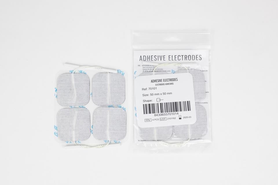 Uso previsto:Para aplicaciones TENS (Estimulación Eléctrica Nerviosa Transcutánea) y EMS (Estimulación Eléctrica Muscular).Composición:No tejido.Adhesivo acrilico.Hidrogel.Espuma (solo tipo FOAM).Características:Con cableCon gel incorporado.Sin látex.Presentación en bolsas de 10 packs con envase individual.Fácil de aplicar.Reutilizable con una correcta higiene del paciente una adecuada conservación.Bolsa: 4 unidades. Caja: 10 bolsas de 4 unidades.Embalaje: 500 bolsas de 4 unidades.