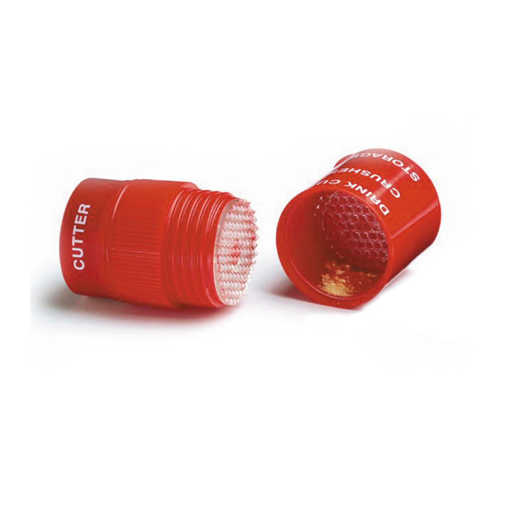Cuenta con cierre en rosca para mayor precisión, un depósito para guardar las pastillas y una cuchilla para corte y base rugosa para hacer la trituración más precisa.