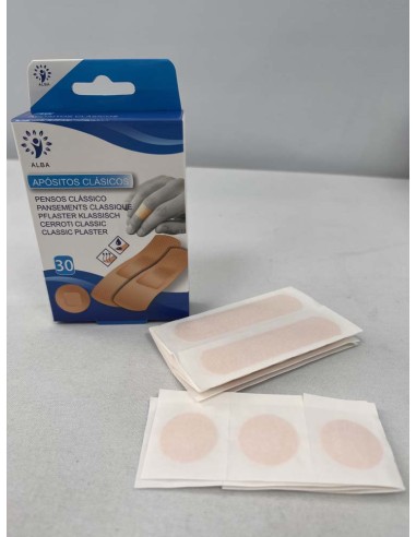 Los apósitos clásicos 30 son más habituales para tener siempre a mano. Contiene con tres formatos: apósitos redondos para cubrir heridas de pequeñas dimensiones y en lugares visibles como la cara, y apósitos en tiras de dos longitudes y anchos. Su adhesivo es hipoalérgico y el soporte es resistente al agua, ideales para zonas con movilidad.
