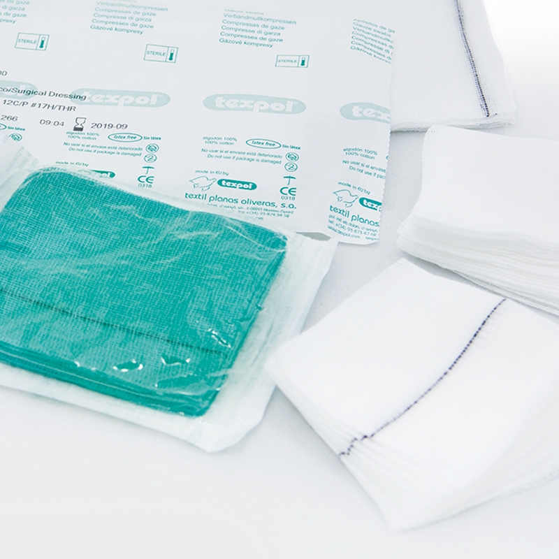 Apósitos de gasa hidrófila absorbente cortados y plegados, 100% algodón. No contienen látex.