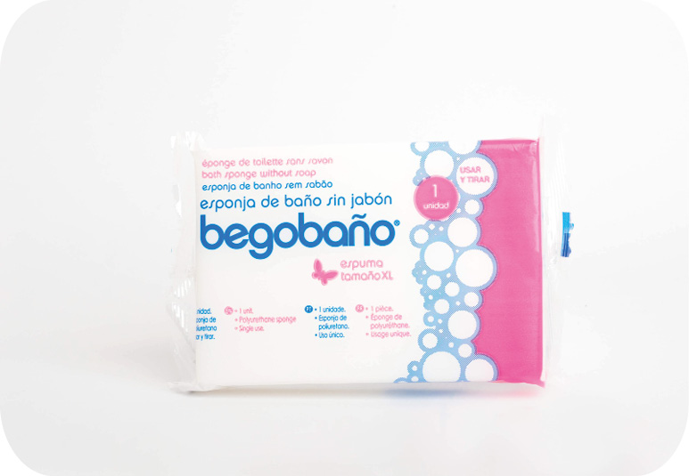 Esponja BEGOBAÑO jabonosa (espuma de poliuretano) de un solo uso para una correcta limpieza e higiene de la piel. 7,5 x 13cm. Caja 1200u