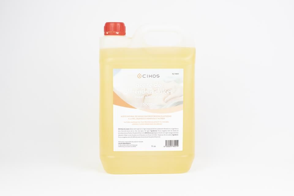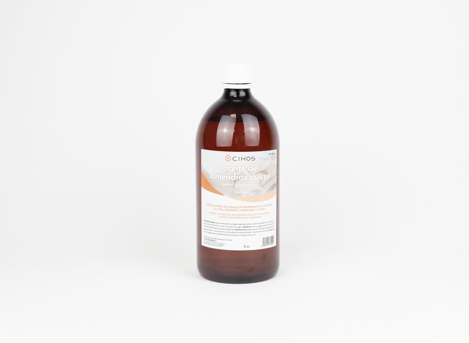 CIKOS Aceite de Almendras Dulces, muy hidratante, con propiedades emolientes y antiinflamatorias, indicado para masajes, suaviza la piel sin obstruir los poros. Color amarillo. 99,5% almendra .0,5 vitamina E. Formato de 1 litro.